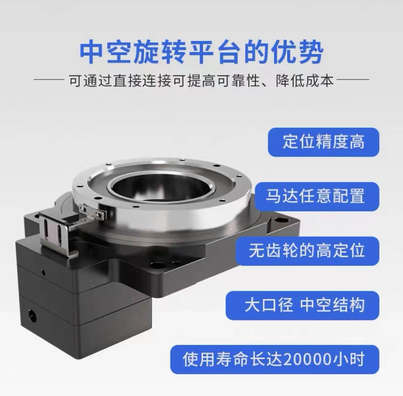 中空平臺可以實現(xiàn)任意角度的分割和停頓,能適應復雜的運動規(guī)律,而凸輪分割器則只能實現(xiàn)定時的間歇運動中空旋轉(zhuǎn)平臺需要注意的是載荷能力,旋轉(zhuǎn)平臺必須具備足夠的承載能力,以保證其在旋轉(zhuǎn)過程中不會失穩(wěn)或發(fā)生傾斜。精密中空旋轉(zhuǎn)平臺的使用壽命長、運動平穩(wěn)、精度高,適用于需要高精度、高精度的自動化設備,如輸送帶和包裝設備等等,廣泛應用于機械加工、自動化生產(chǎn)線、機器人等等。